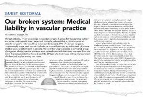 I read with both interest and disappointment Dr. Andrew J. Meltzer’s guest editorial regarding medical malpractice published in the October issue of Vascular Specialist. He unfortunately chose the often traveled, but dead-end road of blaming the legal system for the current state of the medical malpractice system. This approach neglects the basic tenets of medical malpractice law.